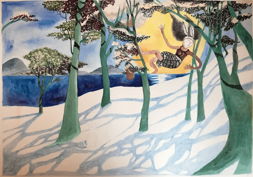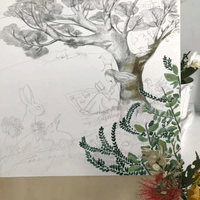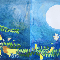 First step,create the characters, which were three characters created in Photoshop, Rona, Shuiyue and Mittens. Firstly,I drew the characters on the paper and then took the photo, poured it into Photoshop, and then extracted the line drawing to create a silhouette, after distinguishing the main light and dark, I drew the parts of the character in different colors, created different layers for different parts, and finally merged all the layers when I was satisfied. What I have always wanted to explore is how to create hand-drawn texture effects in digital form, so that digital works produce a hand-drawn texture as much as possible, the process is difficult, so after deciding to draw three characters in Photoshop, I just used PS to lay the manuscript with a large color, roughly creating the atmosphere and space of each picture, and finally I decided to use watercolor paint brushes combined with colored pencils to continue the creation of this picture book, and finally scan it into the computer and adjust the color with PS.